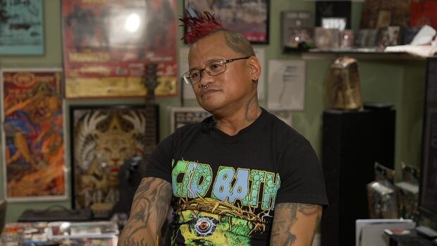 Saskatoon resident Roque Andres, Jr., known for his work as an ironworker and his bass playing in the local metal band Nox Umbra, has a passion for collecting mementos from live rock concerts. His house is a tribute to his love for music, adorned with concert set lists, day sheets, guitar picks, drum sticks, signed gig posters, and photos from various performances. Andres estimates his collection includes around 400-500 gig posters, 200 set lists, 300-400 guitar picks, and 100 drum sticks, with about 1,000 items signed by artists. He also possesses rare pieces like signed vinyl albums and unique artworks from musicians.